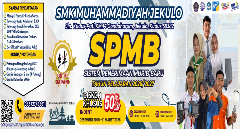 Untuk Pendaftaran PPDB Daring bisa di klik pada tautan disamping pada halaman website ini. Dan untuk pendaftaran Luring bisa langsung datang ke SMK Muhammadiyah Ponpes Jekulo. Kami melayani pendaftaran Luring Setiap hari Senin - Sabtu jam 07.00 WIB - 15.00 WIB.